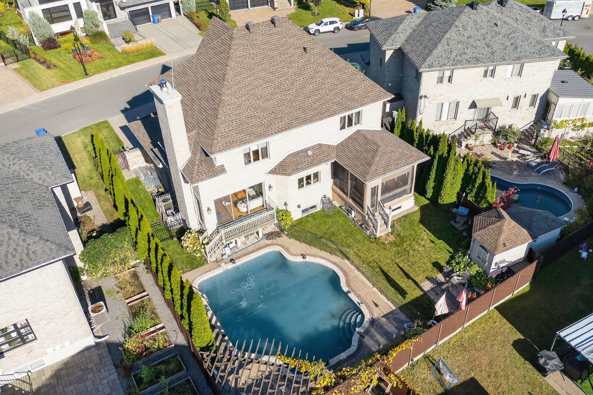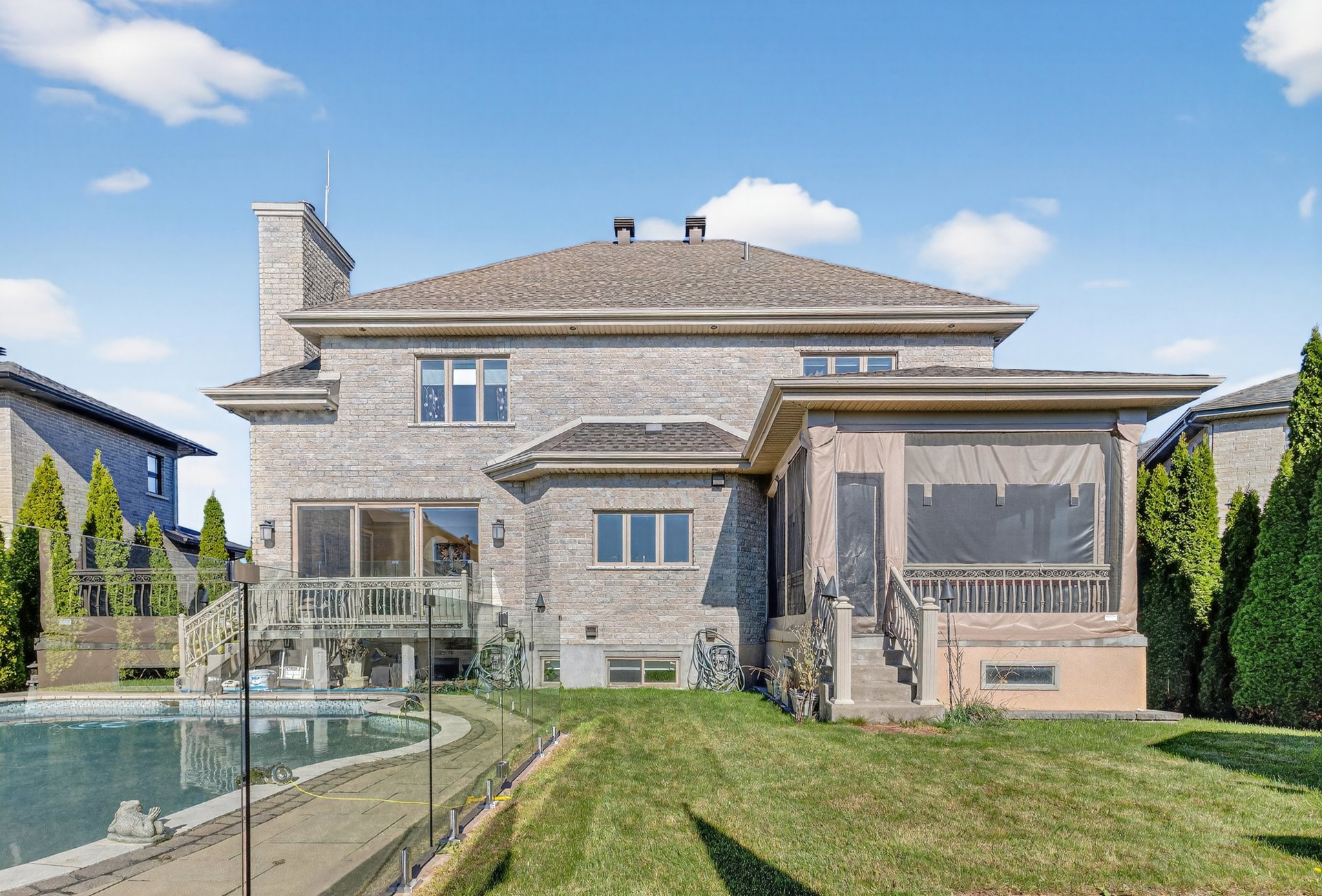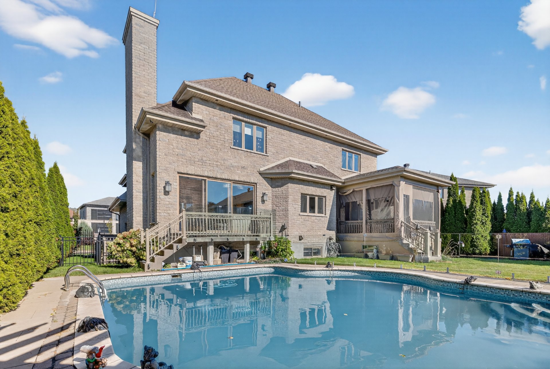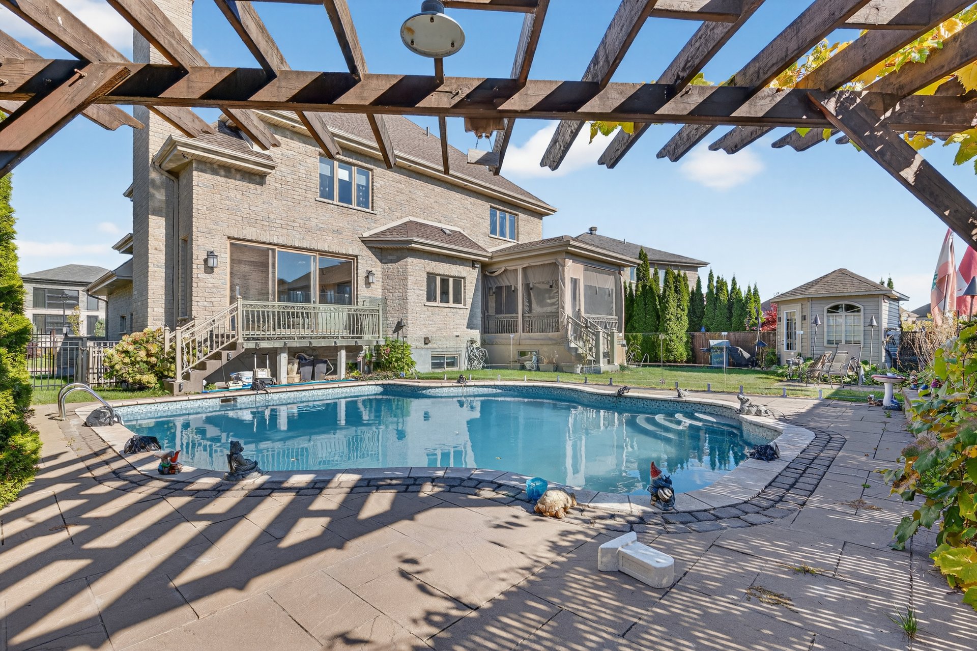 Included Light fixtures, curtains, curtain rods, fridge, stove, dishwasher, washer, dryer, microwave oven, stove fan, two tv sets (one on main floor, one in basement), garage remote (2x remotes), hot water tank, central vaccuum and accessories, pool accessories (robot cleaner, heat pump), cabanon, cabanon fridge, sound system + all speakers, covered shed and curtains, exterior lights (controllable by remote)